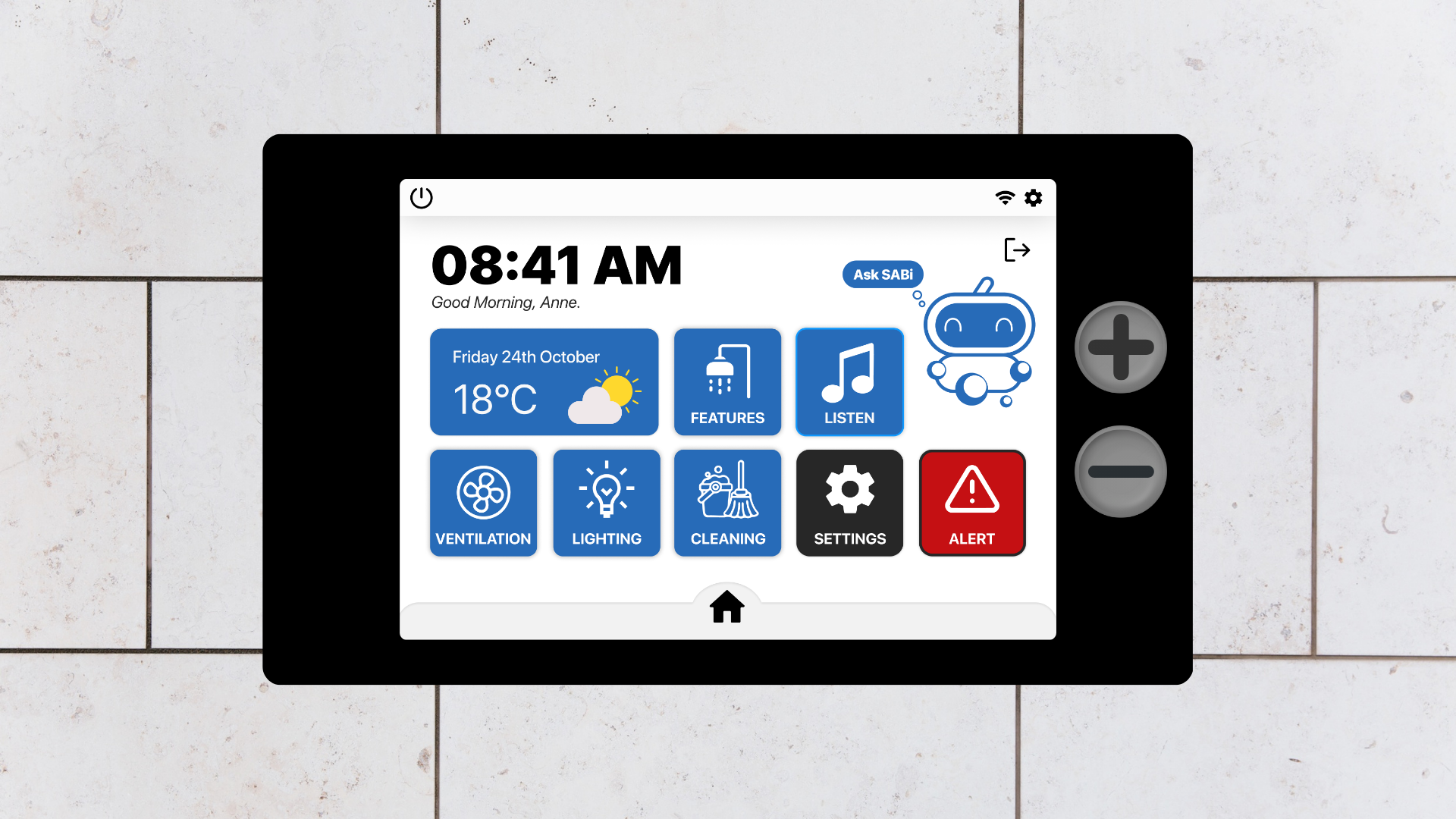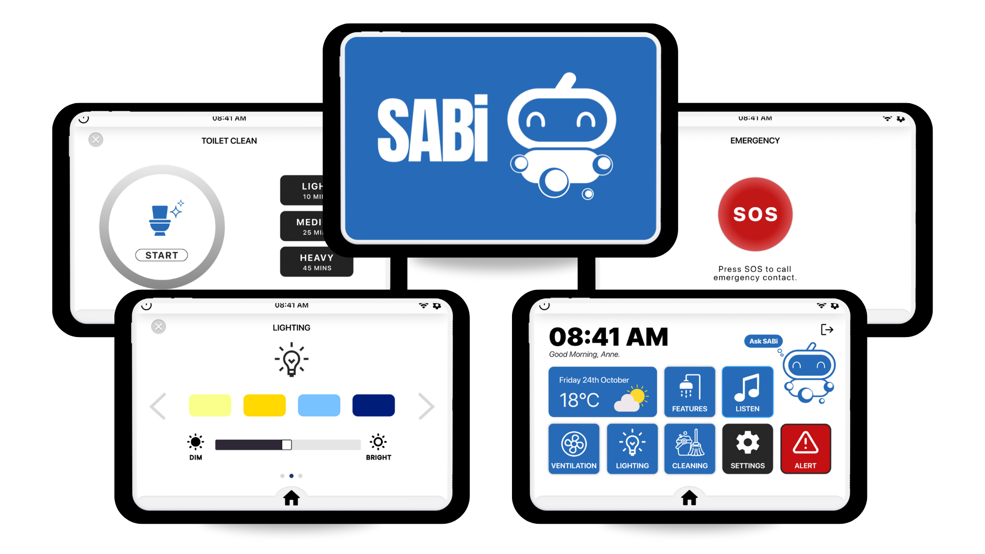 Our final solution was a Smart system that could be voice activated or controlled by a panel in the bathroom.This system is called SABi, a tool that can customise the bathroom experience depending on the user walking in. The system will adjust the shower temperature, lighting and toilet height for each person of the household which are predetermined settings set up. SABi can also play the radio, self clean appliances like the shower, toilet and sink, and can call for help if a fall is detected.